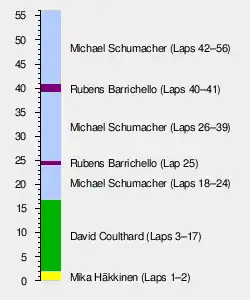 On the tenth lap, Coulthard ran off the track at turn six,[2] with grass penetrating his left-hand radiator inlet and blocking the hot air release pipes.[10][51] This increased the engine temperature in Coulthard's car,[6] and McLaren was forced to amend his race strategy when his engine overheated too much.[55] Further down, Gené lost 13th position to Alesi, as Trulli made a pit stop for further repairs to his car.[51][52] Coulthard had a 5.6-second lead over Michael Schumacher by the start of lap twelve, with Verstappen passing Button for tenth. Häkkinen moved up to 14th after passing Ralf Schumacher and Gené in the next three laps.[51][52] Salo and Alesi became the first drivers to make scheduled pit stops on lap 16.[51] Coulthard made an early pit stop one lap later to clear the debris from his radiator, resolving his overheating problem.[6][10][51] He rejoined the circuit in sixth.[2] The McLaren duo were on different strategies, with Coulthard making two pit stops and Häkkinen one.[49] Button became the race's next retirement when his engine failed on lap 19.[10][37] Michael Schumacher continued to set successive fastest laps, building an 8.8-second lead over Rubens Barrichello by the time of first pit stop on lap 24 after becoming concerned that Coulthard was quicker than him.[10][52] Barrichello led for one lap before his pit stop on the following lap returned Michael Schumacher to the lead.[51]
