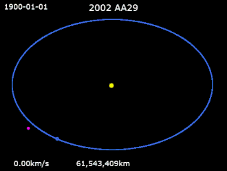 2002 AA29 (also written 2002 AA29) is a small near-Earth asteroid that was discovered on January 9, 2002 by the LINEAR (Lincoln Near Earth Asteroid Research) automatic sky survey. The diameter of the asteroid is only about 20–100 metres (70–300 ft). It revolves about the Sun on an almost circular orbit very similar to that of the Earth. This lies for the most part inside the Earth's orbit, which it crosses near the asteroid's furthest point from the Sun, the aphelion. Because of this orbit, the asteroid is classified as Aten type,[2] named after the asteroid 2062 Aten.