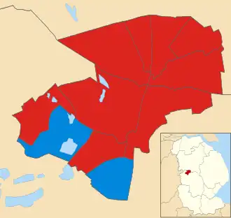 ![]() Map showing the results of the 2002 Lincoln City Council elections by ward. Red shows Labour seats and blue shows Conservative seats. | ||||||||||||||||||||||||||||