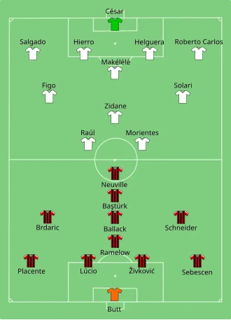 Real Madrid were regarded as favourites before the match and took the lead in the eighth minute through Raúl. Lúcio equalised five minutes later, before Zinedine Zidane scored the winning goal on the stroke of half-time, a left-footed volley into the top corner that has since gone down as one of the greatest goals in the history of the competition,[6] to secure Real Madrid's ninth European Cup.