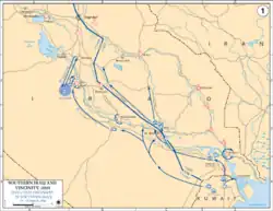 Hostilities of the Gulf War were suspended on 28 February 1991, with a cease-fire negotiated between the UN coalition and Iraq.[42] The U.S. and its allies tried to keep Saddam in check with military actions such as Operation Southern Watch, which was conducted by Joint Task Force Southwest Asia (JTF-SWA) with the mission of monitoring and controlling airspace south of the 32nd Parallel (extended to the 33rd Parallel in 1996) as well as using economic sanctions. It was revealed that a biological weapons (BW) program in Iraq had begun in the early 1980s with help from the U.S. and Europe who were unaware of Iraq's intentions, in violation of the Biological Weapons Convention (BWC) of 1972.[43][44] Details of the BW program—along with a chemical weapons program—surfaced after the Gulf War (1990–91) following investigations conducted by the United Nations Special Commission (UNSCOM) which had been charged with the post-war disarmament of Saddam's Iraq. The investigation concluded that the program had not continued after the war. The U.S. and its allies then maintained a policy of "containment" towards Iraq. This policy involved numerous economic sanctions by the UN Security Council; the enforcement of Iraqi no-fly zones declared by the U.S. and the UK to protect the Kurds in Iraqi Kurdistan and Shias in the south from aerial attacks by the Iraqi government; and ongoing inspections. Iraqi military helicopters and planes regularly contested the no-fly zones.[45][46]