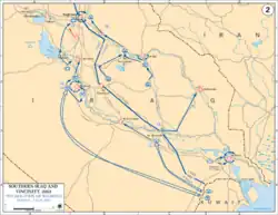 The 2003 invasion of Iraq (U.S. code name Operation Iraqi Freedom (OIF))[22][b] was the first stage of the Iraq War. The invasion began on 20 March 2003 and lasted just over one month,[24] including 26 days of major combat operations, in which a United States-led combined force of troops from the United States, the United Kingdom, Australia and Poland invaded the Republic of Iraq. Twenty-two days after the first day of the invasion, the capital city of Baghdad was captured by coalition forces on 9 April after the six-day-long Battle of Baghdad. This early stage of the war formally ended on 1 May when U.S. President George W. Bush declared the "end of major combat operations" in his Mission Accomplished speech,[25] after which the Coalition Provisional Authority (CPA) was established as the first of several successive transitional governments leading up to the first Iraqi parliamentary election in January 2005. U.S. military forces later remained in Iraq until the withdrawal in 2011.[26]