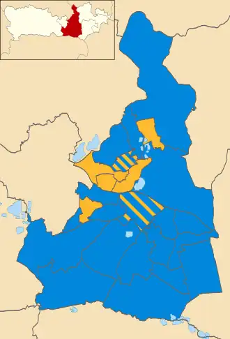The results saw the Conservatives strengthen their control of the council after gaining 6 seats to hold 39 of the 54 seats.[5] The Liberal Democrats fell back to 15 seats, while Labour lost their only seat on the council.[5] The leader of the Liberal Democrats on the council, Coling Lawley, only survived the election by 4 votes in Coronation ward after 3 recounts.[6] Overall turnout was 40.3% a rise of over 10% from the 2003 election.[6]