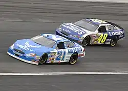 Meanwhile, Jimmie Johnson, the only Hendrick Motorsports driver in contention after teammates Jeff Gordon, Brian Vickers, and Terry Labonte had crashed and Kyle Busch had fallen back, was in fourth for the final restart with five laps remaining. After passing pole-sitter Ryan Newman and Carl Edwards, Johnson had a shot to win the race and beat Bobby Labonte. With four to go, Johnson closed the gap from a few car lengths to be on Bobby Labonte's back bumper with three to go. On the final lap, Johnson attempted to pass Labonte on the inside but was not able to get there and went back behind Labonte. In the final two corners, Johnson tried the outside and was able to make it stick and Johnson beat Labonte to the finish by .027 seconds, the closest finish in Lowe's Motor Speedway history since the introduction of electronic scoring.[10] The win was Johnson's third consecutive 600, a NASCAR record, passing six drivers (Jeff Gordon, Dale Earnhardt, Darrell Waltrip (twice), Neil Bonnett, and Buddy Baker) for the record.[3][11] It was also Johnson's third win in a row at Lowe's. Edwards, Jeremy Mayfield and Newman rounded out the top five,[12] Greg Biffle, Martin Truex Jr., Dale Jarrett, Ken Schrader, and Rusty Wallace closed out the Top 10.[8]