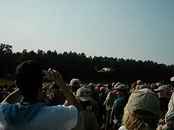 President George W. Bush was scheduled to attend the second show, along with Senator Bill Frist, but was not able to attend due to impending thunderstorms expected to hit about the time of the show or shortly after. However, Frist was already en route to the show when it was canceled and consequently delivered his speech. He emphasized the "Support our Scouts" bill recently passed in the Senate. A number of participants and staff members were treated for heat exhaustion and heat stroke while Frist was delivering his speech—at one point, his voice was competing with a helicopter airlifting one victim to a nearby hospital.[2] Part of the problem arose due to a lack of drinking water. Due to security for the President's visit, those entering the amphitheater were not permitted to bring any liquid through the security checkpoints (among other restrictions). There were several water buffalos provided by the Army, but long lines to refill empty bottles dissuaded many from filling their bottles. The second show was finally canceled due to extreme temperatures. It also began to rain heavily as Scouts returned to their campsites. The trip to and from the second arena show earned the moniker "the death march" among scouts attending the jamboree due to the distances scouts were required to travel in extreme heat, from the Bataan Death March experienced by American POWs in the Pacific theater of WWII. About 300 Boy Scouts were treated for heat exhaustion after waiting for President Bush to arrive at a memorial service for four Scout leaders who were killed while pitching a tent beneath a power line. [3][4]