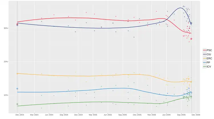 - ^ "CiU se distancia del PSC y amplía su ventaja hasta seis puntos y 16 escaños". La Vanguardia (in Spanish). 15 October 2006.