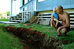 Modified Mercalli Intensities were VII–VIII (Very strong–Severe) on the western side of the island of Hawaii, and VI (Strong) on the eastern side of Maui. Intensity V (Moderate) shaking was felt all the way to Oʻahu, where patches of moderate damage were reported.[6] The earthquake caused property damage, injuries, landslides, power outages, and airport delays and closures.[4] Governor Linda Lingle issued a disaster declaration for the entire state.[7][8]