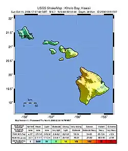 The 2006 Kīholo Bay earthquake occurred on October 15 at 07:07:49 local time with a magnitude of 6.7 and a maximum Mercalli intensity of VIII (Severe). The shock was centered 21 kilometers (13 mi) southwest of Puakō and 21 km (13 mi) north of Kailua-Kona, Hawaiʻi, just offshore of the Kona Airport, at a depth of 38.2 km (23.7 mi). It produced several aftershocks, including one that measured a magnitude of 6.1 seven minutes after the main shock. The Pacific Tsunami Warning Center measured a nondestructive tsunami of 4 in (100 mm) on the coast of the Big Island.[4]