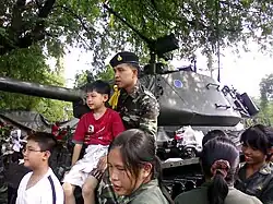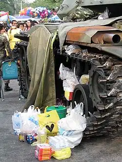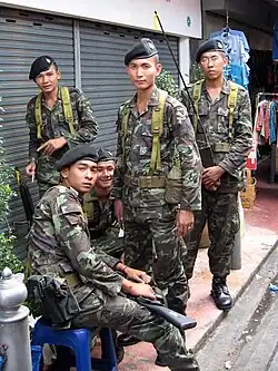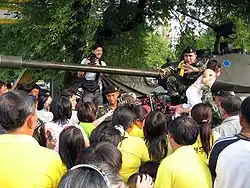 The army declared martial law nationwide, ordered all soldiers to report to their barracks and banned troop movements unauthorised by the CDR.[21] Television footage showed heavily armed troops in M113 armored personnel carriers and M998 HMMWV vehicles on the streets of the city. Many soldiers and military vehicles wore strips of yellow cloth as a symbol of loyalty to the king, whose royal color is yellow.