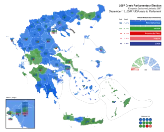 Parliamentary elections were held in Greece on Sunday, 16 September 2007 to elect the 300 members of the Hellenic Parliament. The leading party for a second term was New Democracy under the leadership of Kostas Karamanlis with 42%, followed by George Papandreou and PASOK with 38%. New Democracy managed to secure an absolute but narrow majority of 152 out of 300 seats in parliament. The populist Popular Orthodox Rally entered the parliament for the first time with 10 seats, while the parties of the left, the Communist Party of Greece (KKE) and Syriza, enjoyed a significant increase in their vote share. KKE received 8% of the votes (up from 6%) and won 22 seats (from 12), while Syriza received 5% of the votes (up 2 pp) and 14 seats.