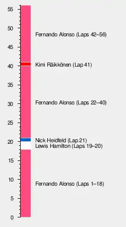 While the two Ferraris were delayed behind Hamilton, Alonso was pulling away at the front, setting fastest laps on laps seven and fifteen. On lap 12, Robert Kubica was the first man to pit for fuel and fresh tyres, however he reported traction control problems four laps later and lost places.[37] Alonso had extended his lead over Hamilton to 15 seconds by the first round of pitstops.[1] He had experienced radio problems before refuelling, but these were fixed during the stop. The Renaults were circulating in eighth and tenth by the pit stops, with Fisichella ahead of Kovalainen. Button was one of the few drivers who started on the slower harder tyre and was dropping down the field, as Takuma Sato passed the Briton.[38] All of the front runners were on the same tyre strategy,[38] with Räikkönen being the first front runner to pit. He found himself behind Fisichella as he exited. A short pit stop by Hamilton enabled him to come out of the pits ahead of the Renault, leaving a car between himself and Räikkönen during the pit window. Heidfeld's late stop on lap 22 helped him stay ahead of Massa.[37] The top five positions remained unchanged, however Hamilton's different strategy enabled him to escape Räikkönen and close in on leader Alonso at a second per lap. Despite pitting on lap 20, he set the fastest lap of the race on lap 22 in 1:36.701.[1]