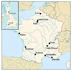 It was announced in April 2003 that France had won the right to host the tournament.[4] The tournament was moved to the proposed September–October dates with the tournament structure remaining as it was.[4] It was also announced that ten French cities would be hosting games, with the final at the Stade de France.[4] French Prime Minister Jean-Pierre Raffarin said that "this decision illustrates the qualities of our country and its capacity to host major sporting events...This World Cup will be the opportunity to showcase the regions of France where the wonderful sport of rugby is deeply rooted".[4] French Sports Minister Jean-François Lamour said that "The organisation of this World Cup will shine over all of France because ten French towns have the privilege of organising matches and to be in the world's spotlight."[4] French cities to host games were Bordeaux, Lens, Lyon, Marseille, Montpellier, Nantes, St. Etienne, Toulouse and Paris, and it was also announced that the final would be at the Stade de France in Saint-Denis.[4]