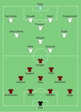Sevilla had an opportunity to open the scoring early on, when Renato pounced on Massimo Oddo's fluffed clearance, but he sent his shot wide. Two minutes later, Milan had a chance to score after Filippo Inzaghi's shot was deflected onto the post by Kaká. Sevilla went 1–0 up on 14 minutes when Renato headed in from Duda's corner. The Sevilla players celebrated the goal by pointing towards the sky.[5] Sevilla almost scored a second goal on 25 minutes, after Gennaro Gattuso's attempt to intercept a Sevilla counter only resulted in him sliding the ball to Frédéric Kanouté, who rounded Dida but played his pass behind Renato. The Brazilian was able to get the ball under control and get a shot off, but saw his shot blocked by Alessandro Nesta. However, Inzaghi tied the score after the break after scoring a free header from Gennaro Gattuso's cross from the right side. Marek Jankulovski found the winner soon afterwards through a lovely left-footed volley to hit a low diagonal shot to the keeper's left. Kaká capped off the fine overall display when he headed home the rebound after his initial shot from a penalty was saved.