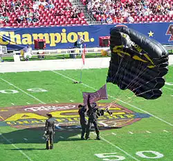 A parachutist from the Special Operations Command parachute team landing at midfield as part of the pregame ceremonies.