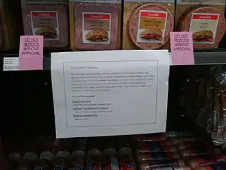 ![]() A meat recall notice placed in the deli section of Sobeys grocery store | |