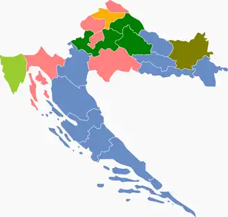 | Zadar | | HDZ, HSS, HSLS, HSP, HSU (50.69%) | 37.51% | | Zvonimir Vrančić, HDZ (55.06%) | 37.45% | first round win |