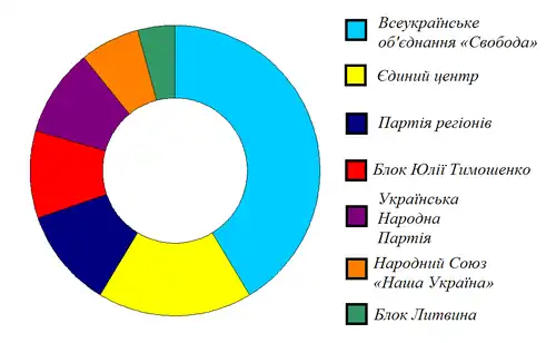 According to political annalist the scores of United Centre and Party of Regions could be caused by mass fraud. Experts were less surprised by the high score of All-Ukrainian Union "Freedom" because (according to the think tank "Open Policy") support for rightist parties like "Freedom" typically builds up in conditions of economic and political crisis and "Freedom" has roots in the region.[13][14] The turnout in Ternopil (city) was only 25%.[15]