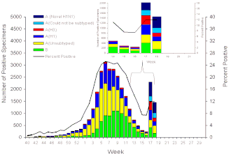 Changes in surveillance of cases of influenza-like illness, including new guidelines for identifying cases to test, increased laboratory testing, and new test kits able to distinguish this novel strain, resulted in a spike in the percent of cases tested positive for influenza. Of the positive cases, about a third were due to the novel strain. Also found were a substantial number of cases where the strain could not be subtyped.[144]
