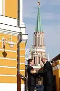 At 10:00 am (MSK), the clock of Spasskaya Tower in the Moscow Kremlin rang and signalled the beginning of the parade commemorating the defeat of Nazi Germany by the Union of Soviet Socialist Republics in the Great Patriotic War. The event then began with the display of the flag of Russia and the Victory Banner. After this, commander of the Moscow Military District Colonel General Valery Gerasimov, who commanded the parade, and Anatoly Serdyukov, the Russian Minister of Defence, who inspected the parade, joined and inspected the troops. At 10:14 am, Serdyukov reported to Supreme Commander-in-Chief, and Russian President, Dmitry Medvedev on the readiness of the troops.[18]