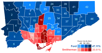Ford's message of putting taxpayers' interests before that of labour and special interests was also said to have attracted wide support among diverse immigrant communities in the inner-city and suburbs (whose demographics contrast sharply with the "urbane creative class" of The Beach and the Annex neighborhoods). By contrast, "people knew precisely nothing about what George Smitherman stood for", according to a spokesman for George Smitherman, who was considered Ford's chief opponent.[7][10][11]