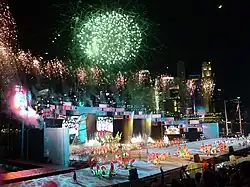 During the "Origins" segment on the city's history, performers entered the stage in freight containers to depict the arrival of the earliest immigrants. The ceremony continued with a dance performance featuring popular songs from the 1940s to the present era. A segment entitled "Monster" told the story of a young boxer who had to fight a giant monster. He summons his Silat warriors to fight against the monster, but they failed, as well as when he summons his Kalari warriors and Wushu warriors. But soon he overcomes his inner fears and defeats the giant monster.[25] Singer Seah Wei Wen then performed "Across The Finish Line" composed by Mayuni Omar & Mathilda D Silva, in the centre of the reflecting pool. It was followed by "Playing with Fire", which featured the dragon as a symbol of courage, strength and wisdom. In this segment, 500 youth from Soka Gakkai Singapore participate to form from many fishes into a dragon.[30] Reflecting the theme of global co-operation, members of the World Youth Orchestra of the Singapore Games performed an orchestral piece featuring various instruments from around the world. The orchestra was led by Darrell Ang, the young associate conductor of the Singapore Symphony Orchestra. The following segment, titled "Bud", depicted rain as a symbol of hope and rejuvenation. Ending the show segment of the ceremony were singers Marcus Lee of Ex-Dee and Lian Kim Selby, performing the song "A New Story", which was commissioned for the event. Their performance was accompanied by a fashion show organized by students from LASALLE College of the Arts.[31]