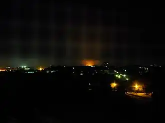 The first of several reported explosions was at around 10 pm local time, and eyewitnesses reported that intermittent explosions occurred during the following hour for two minutes at a time.[6] Media reports said that between 20 and 32 people were killed by the blasts[1][3] and that 300 more were injured as homes were flattened and debris fell from the sky. The deaths were either directly from the explosions or from the effects of high blood pressure.[1] Debris was reported as far as 15 km (9.3 mi) away from the base. At least 200 children were reported to be missing their parents as well; it was unknown whether their parents were missing from the explosions or were separated during the evacuation.[2]