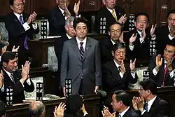 The Liberal Democratic Party had campaigned on a tough stance on the Senkaku Islands dispute, leading to speculation as to how the new government would deal with the issue.[19] Abe made his party's position clear immediately following the election, stating that "[their] objective is to stop the challenge" from China with regards to ownership of the islands.[24] The re-election of the liberal conservative LDP raised concern in foreign media that Japan's relations with its neighbours – China and South Korea – would become strained, given the past visits to the Yasukuni Shrine by LDP prime ministers, the party's perceived de-emphasis of Japan's war crimes committed during World War II and their intention to amend the country's pacifist constitution to give more power to the Self-Defense Forces.[25][26][27] Abe was also in favor of retaining nuclear energy in the country.[18]