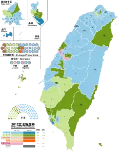 Legislative elections were held in Taiwan on 16 January 2012 for all 113 seats in the Legislative Yuan. For the first time, the legislative elections were held simultaneously with the presidential election. Elected parliamentarians formed the fifteenth Legislative Yuan session since 1946, when the current constitution came into effect. Voting took place on 14 January 2012 between 08:00 and 16:00 local Taipei time at 14,806 polling stations nationwide.[2]