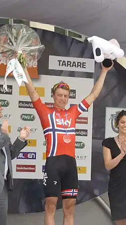 Behind, Team Sky were leading the main group up the Montée de Valmorel, with the pace dislodging numerous riders.[62] Alejandro Valverde (Movistar Team) attempted to chase down Busche, but was brought back with less than 3 km (1.9 mi) remaining. After losing time in the previous day's time trial, Alberto Contador of Saxo–Tinkoff attacked the group,[58] but was chased down by Team Sky's Chris Froome; Froome and Contador were able to catch Busche in the closing stages,[63] with Froome kicking on to take the stage victory and the race leader's yellow and blue jersey, as Dennis had been dropped in the final 2 km (1.2 mi) of the stage.[64] Dennis ultimately fell to third in the general classification, as Froome's team-mate Richie Porte was also able to move ahead by two seconds,[58] but he maintained his lead in the young rider classification.[59]