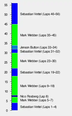 Webber led laps five to seven,[22] because Red Bull advised him that turn three was too wet for dry tyres and he set a series of fast lap times.[42][47] His race engineer, Simon Rennie,[48] told him to enter the pit lane at the conclusion of the seventh lap.[22][49] Hamilton made a pit stop on lap eight.[42] He mistakenly drove into the McLaren pit stall, and the team waved him through to prepare for Button and Pérez's arrival. On that lap, Toro Rosso released Vergne into the path of Pic and they made contact; both drivers had their front wings replaced.[41] The stewards ruled that Vergne was released unsafely into Pic's path and fined the Toro Rosso team $10,000, but Vergne did not incur a post-race time penalty.[50] Rosberg led the eighth lap, until his first stop. After the pit stops, Webber led teammate Vettel and Hamilton. On lap nine, Grosjean passed Ricciardo for ninth position. His teammate, Räikkönen, unsuccessfully attempted to do the same at turn nine. He tried again, and overtook Ricciardo with DRS at the hairpin turn. Two laps later, Grosjean used DRS to pass Pérez for eighth position.[41] On the 12th lap, Räikkönen unsuccessfully tried to pass Pérez for ninth into turn one.[40]