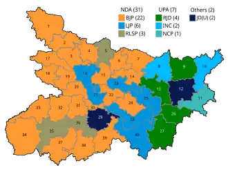 | 40 | Jamui (SC) | LJP | Chirag Paswan | RJD | Sudhansu Shekhar Bhaskar | JD(U) | Uday Narayan Choudhary | |||