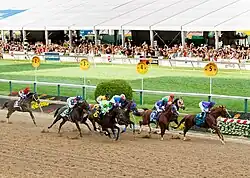 The 2014 Preakness Stakes was the 139th running of the Preakness Stakes. The race was scheduled to start at 6:18 pm Eastern Daylight Time (EDT) on May 17, 2014, at Pimlico Race Course and was run as the twelfth race on a racecard with thirteen races.[1] The race was won by California Chrome, giving him a chance to win the Triple Crown at Belmont. It is the thirty-fourth time a horse has won the first two legs of the Triple Crown.[2] The Maryland Jockey Club reported a track record total attendance of 123,469, the second highest attendance for American thoroughbred racing events in North America during 2014.[3]