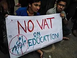 The 2015 Bangladesh student protests on "No VAT on Education" were protests by students of private universities in Bangladesh demanding the VAT imposed on higher education in private universities be eliminated.[1][2] The present Finance Minister of the Bangladesh Awami League government first introduced a 10% VAT upon higher education in private universities in the draft of budget of 2015–16.[3] Following strong opposition, the VAT was reduced to 7.5%.[4] The imposed VAT was withdrawn by the finance division after a cabinet meeting on 14 September 2015.