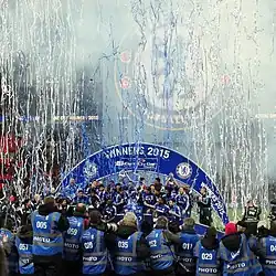 It was contested by Chelsea and Tottenham Hotspur in a repeat of the 2008 Football League Cup final, which the latter team won.[3] Chelsea won 2–0 in the 2015 final, with a goal from captain John Terry at the end of the first half, and a second from Diego Costa in the 56th minute. It was Chelsea's fifth League Cup win, and their first silverware in the second managerial spell of José Mourinho at the club. Chelsea qualified for the next season's UEFA Europa League by winning the match, but eventually qualified for the UEFA Champions League by winning the Premier League. The Europa League place went to Liverpool, who finished sixth in the Premier League.[4]