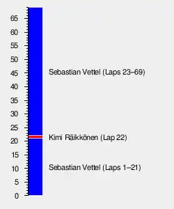 Pit stops started on lap 14, when Bottas and Kvyat were the first to come in, with Massa following suit a lap later, taking his five-second penalty. By lap 18, the two Ferrari drivers in front were unchallenged by Rosberg behind. Sebastian Vettel set a new fastest lap, being 2.7 seconds in front of his teammate, who was a further seven seconds ahead of Rosberg in third. Räikkönen lost one of his front cameras on lap 19, but did not opt to change his front wing.[26] The same lap, Pastor Maldonado and Sergio Pérez touched going into turn one, with Pérez spinning in the process but being able to continue. Maldonado however was handed a drive-through penalty for causing the collision.[27]