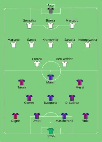 Arda Turan opened the scoring in the 10th minute with a low shot into the bottom right corner from six yards out after a pass from Messi. At the half-hour mark, Claudio Bravo saved a penalty from Vicente Iborra after Samuel Umtiti had blocked a shot that was ruled a handball. A minute before halftime, Sevilla almost got their first goal of the series with Gabriel Mercado's header hitting the crossbar.[4] Turan then got his second one-minute into the second half with a lobbed right foot finish from outside the penalty area.[5] Barcelona's third goal came in the 55th minute with a header scored by Messi after a cross from the left by Lucas Digne.[6][7]