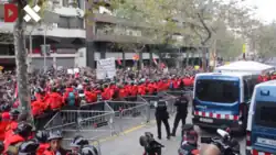 On 3 October, two days after the referendum, hundreds of thousands of demonstrators[3] blocked roads across Catalonia, including main thoroughfares in Barcelona. Farmers blocked highways with their tractors. By 9:30 a.m., the Barcelona bus and subway systems were almost entirely halted.[1] Catalonia's railway company suspended service, the national railway ran minimally, and the ports of Barcelona and Tarragona closed, as did places of work from small stores to the large, wholesale food-trading market Mercabarna.[6] Universities canceled classes[3] and the large public market La Boqueria was nearly empty.[9] The strike included the staff of the Barcelona Museum of Contemporary Art and Sagrada Família basilica, and Barcelona's football team, FC Barcelona.[9][12] Barcelona's airport and most other large industries, however, ran without disruption.[9][13] Many students and farmworkers participated.[6] By midday, in Barcelona, tens of thousands of people occupied the city's major streets—Avinguda Diagonal, Gran Via, Via Laietana—en route to the major demonstrations at the city's administrative center, Plaça Sant Jaume, and the intersection of Barcelona's other city squares at Ronda de la Universitat.[6] Demonstrators gathered before the region's town halls before a planned action at 6 p.m.[6] Barcelona city police later estimated the city's crowd to be 700,000 people in size.[3]