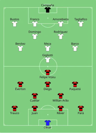 Flamengo scored after eight minutes when Réver headed a free kick from Trauco. Independiente equalized through Emmanuel Gigliotti, who combined with Benitez and finished a counter attack. Seven minutes after halftime, Barco crossed from the left side and Maximiliano Meza scored the winning goal with a right-footed volley.[6]
