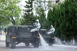 On 2 February 2020, Taiwan's Central Epidemic Command Center postponed the opening of primary and secondary schools until 25 February (originally 11 February).[200][201] In early February 2020, Taiwan's "Central Epidemic Command Center" requested the mobilization of the Taiwanese Armed Forces in both containing the spread of the virus and in building up defenses against it. Soldiers were dispatched to the factory floors of major mask manufacturers to help staff the 62 additional mask production lines that were being set up at the time.[202] In early March, Taiwan's average production of surgical face masks reached 9.2 million per day.[203] By the end of March, the daily production of surgical face masks reached 13 million.[198]
