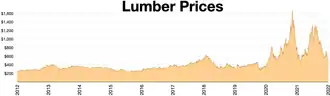 Lumber prices increased with the hot housing market. Potential new American tariffs of 17.99% on Canadian lumber also sent the price higher. Those tariffs were finalized lower to 11.64% by the Biden administration.[16] New contracts that allow semi trucks to haul contracts instead of just rail cars starting August 8, 2022, potentially contributing to normalization of prices in the second half of 2022.[17] Mortgage interest rates rising with inflation is another reason for cooling housing demand and consequently lumber as well.[18]