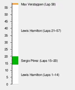 Verstappen made his stop at the end of lap 13 with Hamilton following suit one lap later, both opting for a set of the hardest tyres. The lead drivers pitting elevated Pérez to first, with the Mexican driver being informed his strategy was to hold up Hamilton for Verstappen to catch up.[31] Hamilton caught up on lap 20; a spirited defence from Pérez allowed Verstappen to significantly close the gap from about 11 seconds after the pits to 1.3 seconds.[32][33] Verstappen was unable to take advantage of it, with Hamilton's superior pace extending the gap to four seconds by the midpoint of the race.[31]