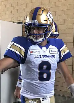 The Blue Bombers defence in 2021 was among the best in CFL history, with just 13.4 points allowed per game, which was their lowest total allowed since 1958 when they had 11.4 points against per game.[24] The team also allowed just six total points scored in the fourth quarter in the first twelve games of the season.[24] The team's quarterback, Zach Collaros, started 13 games and was named the West Division's Most Outstanding Player after finishing the season with a 111.01 quarterback passer rating, which was the tenth best of all time.[26] The team had 15 Divisional All-Stars, the most in the league, with seven on offence, seven on defence, and one on special teams.[27] Despite perennial All-Star running back Andrew Harris missing half of the regular season due to injury, the Blue Bombers finished second in rushing offence in the league, led behind the team's four Division All-Stars on the offensive line.[24][27] With their appearance in this year's Grey Cup, the Blue Bombers surpassed Edmonton for the most Grey Cup appearances of all time with 26.[18]