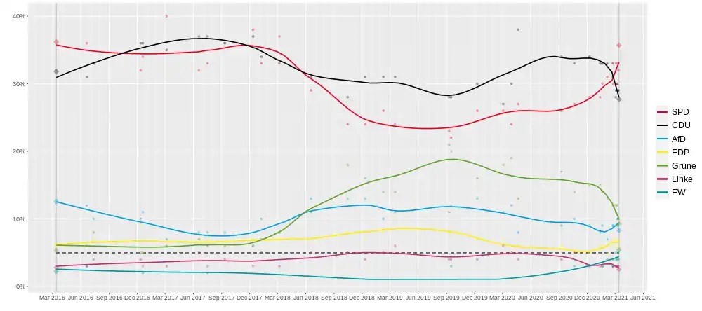 The SPD won an unexpectedly clear plurality of 35.7% of votes cast, less than one percentage point lower than their 2016 result.[2] The opposition Christian Democratic Union (CDU) finished on 27.7%, a decline of four percentage points, its worst result in the state to date. The Greens moved from fifth to third place with 9.3%. Alternative for Germany (AfD) saw the worst losses of any party, falling to 8.3%. The Free Democratic Party recorded a small decline to 5.5% but retained their seats. The Free Voters (FW) entered the Landtag for the first time with 5.4%, marking their third appearance in a state parliament overall, following Bavaria and Brandenburg.[3]