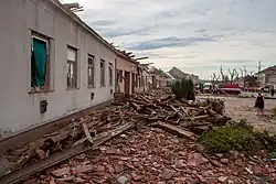 The tornado narrowed further but reached peak strength as it ripped directly through the neighboring town of Mikulčice, leaving widespread destruction and several areas of violent F4 damage. Multiple well-built brick and masonry homes had F4-level structural damage, some of which sustained collapse of thick load-bearing walls, and a few were partially to completely leveled. At one location at the west edge of town, three adjacent masonry homes were completely destroyed at F4 intensity, one of which was flattened with no walls left standing. Several inches of topsoil was scoured from a nearby farm field, and debris from destroyed structures was strewn long distances. Numerous homes and several businesses were heavily damaged or destroyed in the central part of town, including a brick house that was leveled to the ground and had two cars tossed on top of the remaining pile of rubble.[16] Some other homes in this area were left with only a few walls standing, and gravestones were cracked and broken at a cemetery. The exterior walls of structures that remained standing were scarred and impaled by pieces of debris, and streets were left strewn with bricks and lumber.