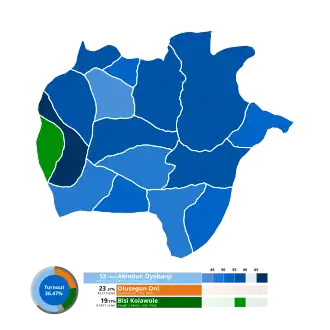 The general election was noted by its great logistical organisation and peaceful voting, despite a turbulent campaign period marked by several notable interparty clashes. By the early morning of 19 June, collation completed and INEC declared Oyebanji as the victor. In total, Oyebanji obtained about 187,000 votes and 53% of the vote as runner-up Oni received around 82,000 votes and 23% of the vote while Kolawole came third with over 67,000 votes and 19% of the vote.[4] Electoral analysis focused on the impact of the ruinous divides within the state PDP compared to the state APC's post-primary reconciliation along with the draw of Oni's candidacy.[5] Civil society and election observer groups concentrated on instances of vote-buying along the highly successful election administration by INEC which resulted in smooth voting, direct online transmission of results, and one of the earliest winner declarations in recent Nigerian history as the result was announced on the night of the election.[6]