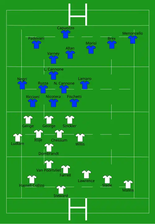 - Tommaso Menoncello (Italy) had been named to start but withdrew ahead of the game and was replaced by Luca Morisi and Marco Zanon replaced Morisi on the bench.