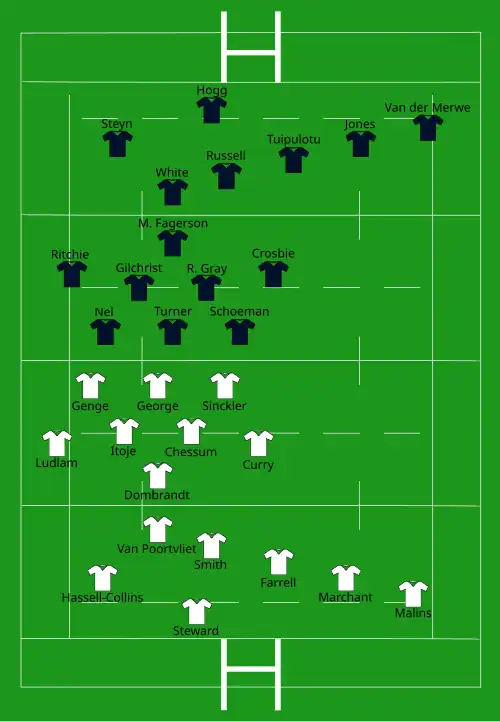 | Try: Turner 29' c Steyn (2) 50' c, 57' m Kinghorn 70' m M. Fagerson 78' m Con: Russell (2/5) 31', 52' Pen: Russell (2/2) 8', 14' | Report | Try: Owens 33' c Con: Biggar (1/1) 35' |
