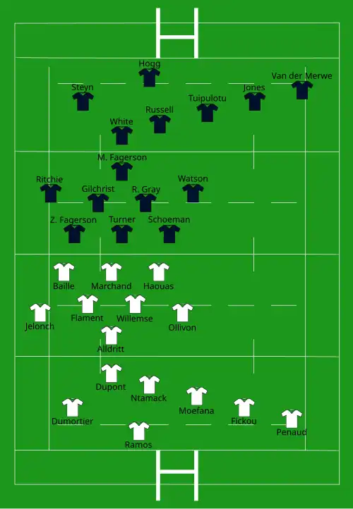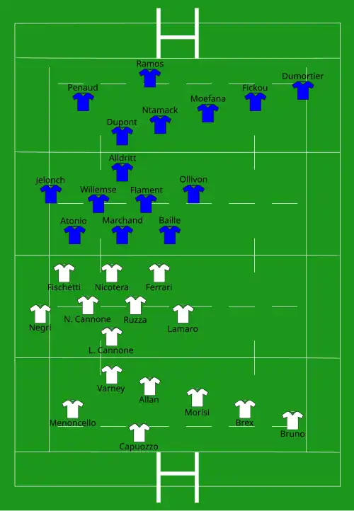 | Try: Capuozzo 32' m Penalty try 51' Pen: Allan (4/5) 14', 23', 40+2', 62' | Report | Try: Flament 5' c Ramos 19' m Dumortier 27' c Jalibert 67' c Con: Ramos (3/4) 6', 28', 68' Pen: Ramos (1/2) 47' |