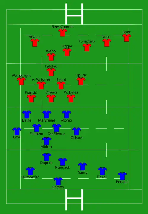 | Try: Penaud (2) 9' c, 76' Danty 33' c Atonio 43' c Fickou 48' c Con: Ramos (5/5) 11', 34', 44', 49', 76' Pen: Ramos (2/2) 25', 29' | Report | Try: North 7' c Roberts 55' c T. Williams 65' c Dyer 79' c Con: Biggar (3/3) 7', 56', 66' Halfpenny (1/1) 80' |