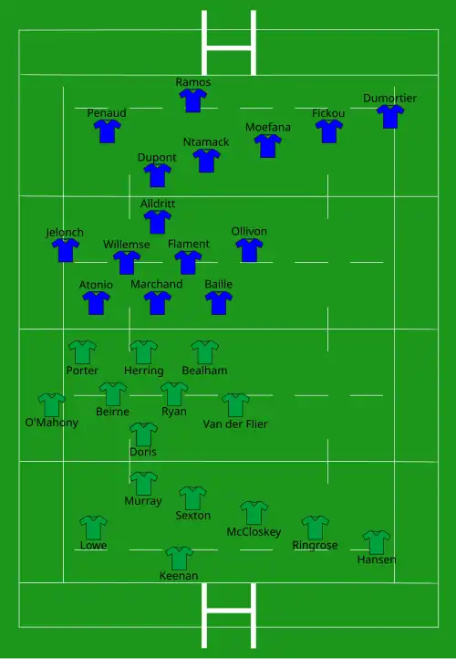 | Try: Keenan 8' c Lowe 21' m Porter 26' c Ringrose 71' c Con: Sexton (2/3) 10', 26' Byrne (1/1) 73' Pen: Sexton (1/1) 40' Byrne (1/1) 59' | Report | Try: Penaud 17' c Con: Ramos (1/1) 18' Pen: Ramos (3/4) 4', 14', 32' Drop: Ramos (1/1) 61' |
